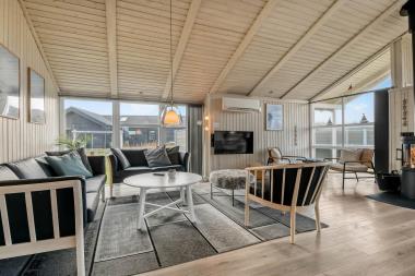 96 m2 stort, Rummeligt og komfortabelt indrettet feriehus i træ. Opholdsstuen er åben til kip og store vinduespartier, giver et rigtig godt lys inde i huset. Opholdsstuen er opdelt i spisestue, som er kombineret med det åbne nye køkkenhjørne. Opholdsstuen med, lædermøbler, spisebord, bluetoohthøjtaler, Smart-TV med danske og tyske programmer samt mulighed for streaming af TV/radio/apps. Nyd udsigten over området og slap af foran den knitrende, nye brændeovn som sammen med varmepumpen hjælper med at reducere udgiften til varmeregningen. Flot, nyt og praktisk hårdt gulv i opholdsrum og køkkenhjørne. 4 gode soverum (2ES, 1DS, 1DS, 1KS) samt en hems med 2 ekstra sovepladser) I hvert soveværelse med dobbeltseng er der et Smart-TV med mulighed for streaming af egne programmer. Til de små gæster er der puslepude og babybadekar til rådighed. Nyt køkkenhjørne med alt i service / køkkengrej samt komfur med glaskeramiske kogeplader, emhætte, opvaskemaskine, køleskab med fryseboks og mikroovn. Huset råder over 2 badeværelser begge med klinkegulv med gulvvarme, toilet, håndvask og bruser. Det ene badeværelse er med helt nyt spabad og direkte adgang til saunaen samt ny vaskemaskine. Ikke ryger hus. 1 husdyr er tilladt.