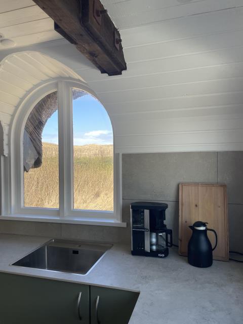 Huset ligger i en lille gryde omgivet af klitter, hvilket giver en skøn læ og en særlig rolig atmosfære. Samtidig er beliggenheden helt unik – i første række til det brusende Vesterhav – så naturen og havets beroligende lyde altid er tæt på.