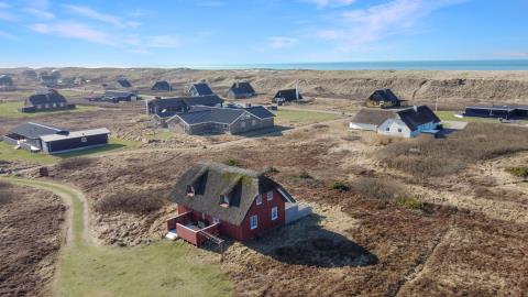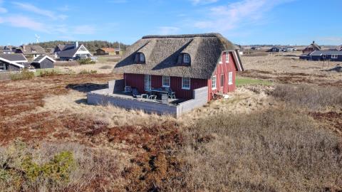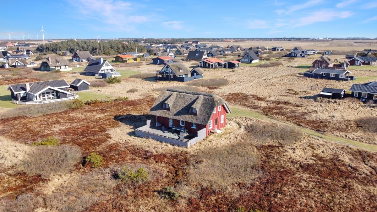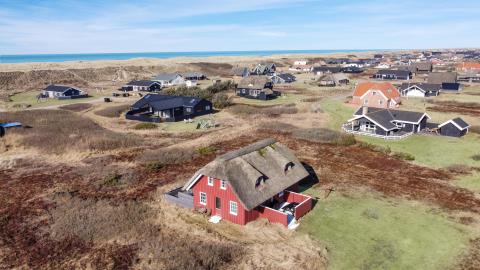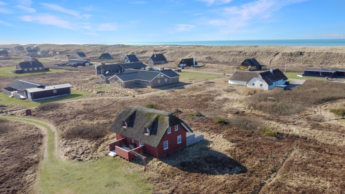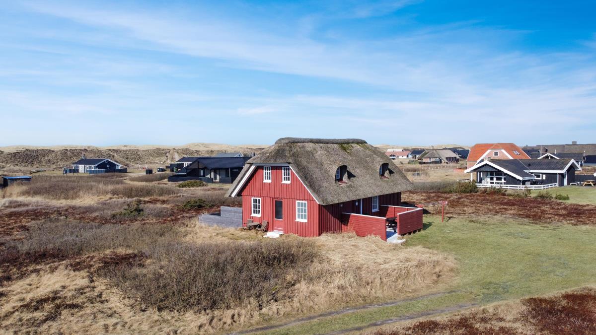 Dette idylliske nyrenoveret feriehus i træ med stråtag er beliggende på en naturgrund tæt på Vesterhavet, huset er bygget i 2 etager, og har plads til 6 personer. I 2023 er huset moderniseret blandt andet nye møbler og nyt køkkenservice m.m. Der er gratis trådløs internetadgang.