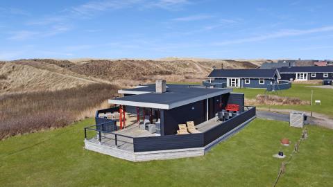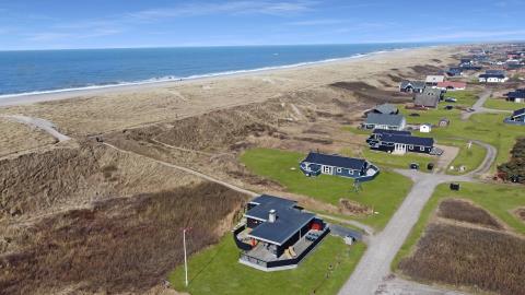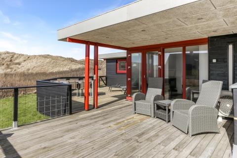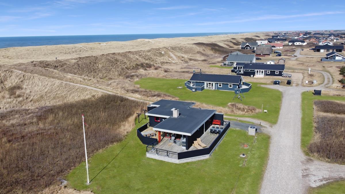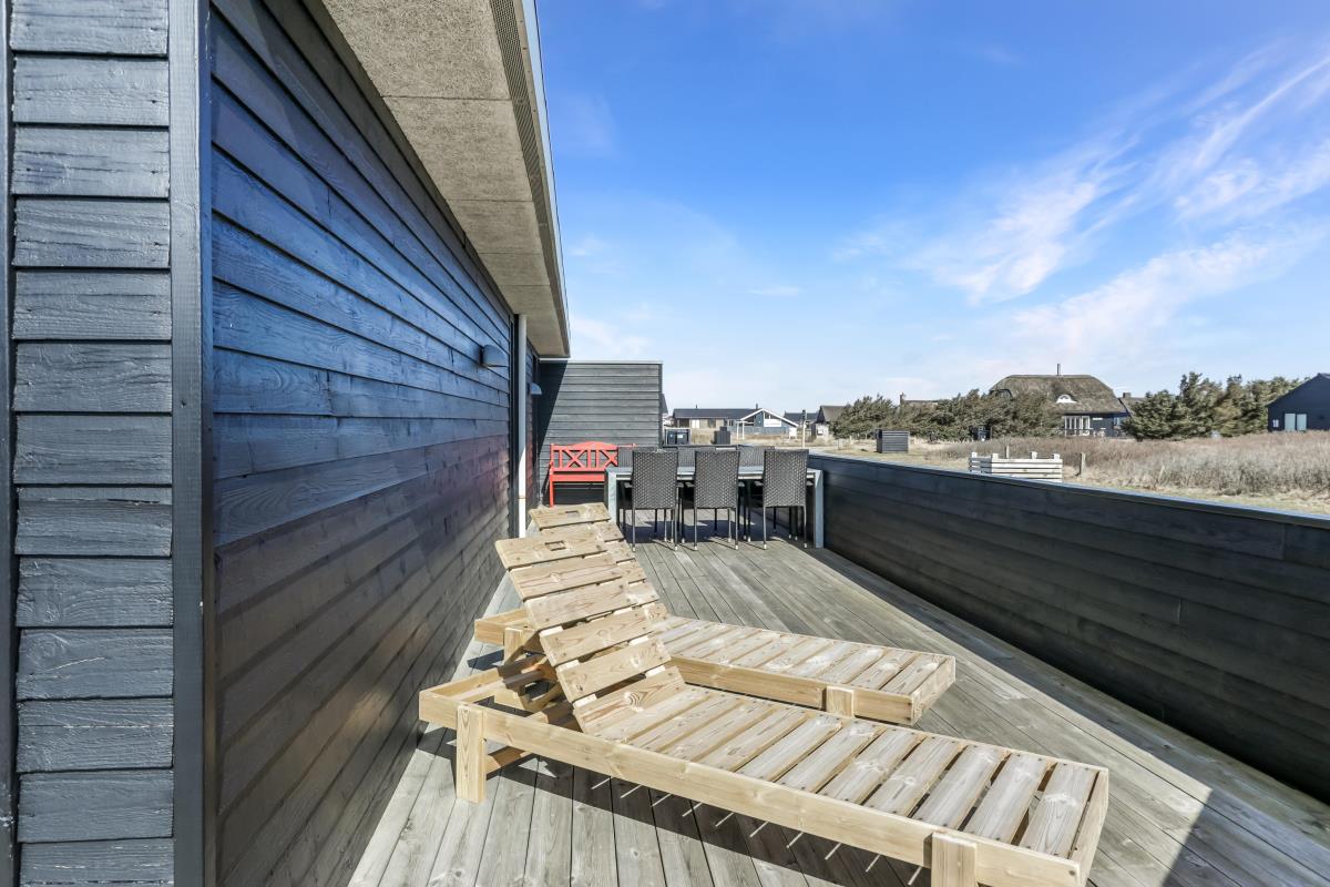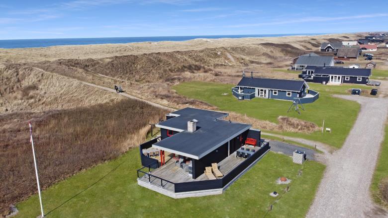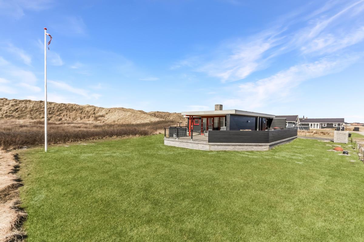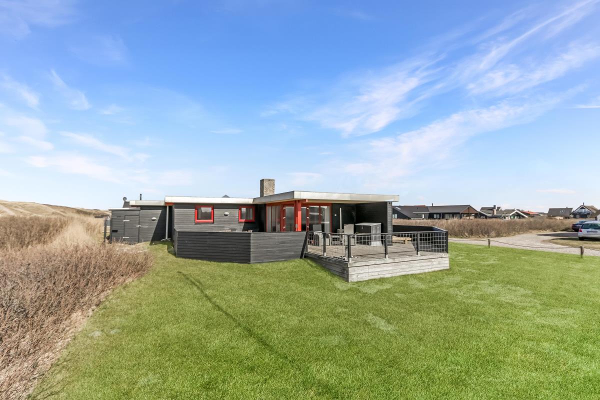 Huset har udgang til en dejlig delvis overdækket og indhegnet terrasse med udsigt til de høje klitter. Terrassen er helt indhegnet og med låger. Der er havemøbler og liggestole. Er der børn er der rige muligheder på den over 3.000 m2 store grund. Parker bil og nyd dette charmerende sommerhus tæt ved Vesterhavet. Tænd grillen og spis aftensmaden på den dejlige terrasse til lyden af bølger, der som skyller i land lige på den anden side af de betagende klitter som ligger ca. 100 m fra huset.