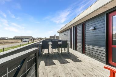 Huset har udgang til en dejlig delvis overdækket og indhegnet terrasse med udsigt til de høje klitter. Terrassen er helt indhegnet og med låger. Der er havemøbler og liggestole. Er der børn er der rige muligheder på den over 3.000 m2 store grund. Parker bil og nyd dette charmerende sommerhus tæt ved Vesterhavet. Tænd grillen og spis aftensmaden på den dejlige terrasse til lyden af bølger, der som skyller i land lige på den anden side af de betagende klitter som ligger ca. 100 m fra huset.