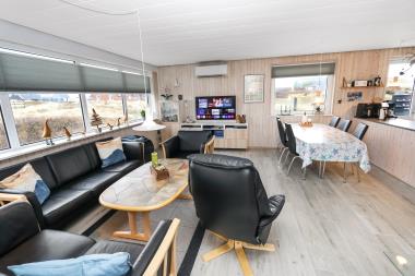 100 m2 stort feriehus, bygget i 1973 og løbende renoveret – sidste gang i 2022. Rummeligt og komfortabelt indrettet. Opholdsstuen er kombineret med det åbne køkkenhjørne. Opholdsstuen med lædermøbler, spisebord, Smart-TV med danske og tyske programmer samt mulighed for streaming af TV / radio / Apps via Chromecast, så har du en mobiltelefon eller et andet device med, kan du streame, hvad du nu har af abonnement. Nyd udsigten over området, de høje klitter ved Vesterhavet og slap af foran den knitrende brændeovn / pejseindsats, som sammen med varmepumpen hjælper med at reducere udgiften til varmeregningen. Laminatgulv i opholdsrum og gulvtæppe i soverum. 3 gode soverum (2ES, 1DS, 1ES). Køkkenhjørne med alt i service / køkkengrej samt komfur med glaskeramiske kogeplader, emhætte, opvaskemaskine, køleskab med fryseboks og mikroovn. Dejligt badeværelse med toilet, håndvask, bruser, vaskemaskine og tørretumbler. Huset er meget personligt indrettet og bærer tydeligt præg af, at ejer ofte er i huset og elsker at være der. Ikke ryger hus. Husdyr må ikke medbringes.