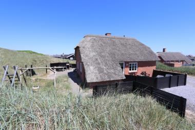 Bygget helt op til fredningslinien og i første klitrække og som det sidste hus på vejen ligger dette flotte og velholdte, stråtækte feriehus med egen pool. Huset er komfortabelt indrettet og meget velegnet også til 2 familier (4 voksne og 4 børn). 2 husdyr er tilladt. Gratis internetadgang.