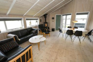 Stuen er holdt i lyse farver og indrettet med gode lædermøbler, spisebord, TV med danske og tyske programmer, brændeovn samt varmepumpe. Brændeovnen og varmepumpen sikrer en behagelig varme året rundt og bidrager til en lavere forbrugsregning ved afrejse.