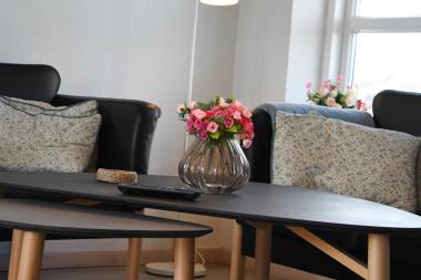 Indretningen byder på en hyggelig stue med brændeovn og varmepumpe, veludstyret køkken samt 2 badeværelser, hvoraf det ene har spa og sauna.