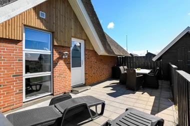 Stråtægt feriehus i 2 etager for en eller flere familier som ønsker at tilbringe ferien sammen. Huset er bygget i sten og med stråtag og ligger på en 12oo m2 stor naturgrund 300 m fra vesterhavet. Trægulve med løse tæpper i køkken og stue, dog er der klinker i forgang. Soverummene er belagt med tæpper. Huset er særdeles veludstyret. I stueetagen findes det store badeværelse med 2 pers spa, brusenichie og gulvvarme. Desuden er der vaskemaskine og tørretumbler. Fra badeværelset er der direkte adgang til saunaen. Desuden er der gæstetoilet med håndvask. Veludstyret køkken med opvaskemaskine, mikroovn og 30 l fryser. Opholdsstuen som er kombineret med køkkenet indeholder brændeovn, radio samt fibernet tv med tyske og danske samt chromecast. Trådløst Internet. Huset har 3 soverum : På 1. sal er der (2E)+(2E) og i stuetagen er der (2E). Et pragtfuld feriehus på alle årstider.