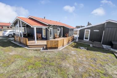Fra stuen er er udgang til et dejligt terrasseanlæg giver unikke muligheder for en plads i solen hele dagen og der er masser af havemøbler. Der er ligeledes liggestole og grill, som kan flyttes efter behov samt et hyggeligt fast bord med 4 stubbe som siddeplads. Der er opdat kraftstik ved huset – som er pefket til opladning af hybrid- eller el-bil. Sandkasse til de mindste. Terrasseanlægget byder både åbne terrasser samt delvis overdækket terrasse med læ. Et helt fantastisk gennemført hus, som giver rammerne for en fantastisk ferie ved Vesterhavet der hver dag byder på nye maleriske oplevelse, der invitere til en frisk gå- eller løbetur. Eller hvad med en lille gåtur på ca. 15 – 20 min op til områdets lille købmand, som i sæsonen har åbent og byder på frisk morgenbrød, og hvor de daglige indkøb også kan klares. Så hvad enten du er til aktiv ferie eller total afslapning, danner dette flotte feriehus den perfekte ramme både hvad angår hus, beliggenhed og omgivelser.