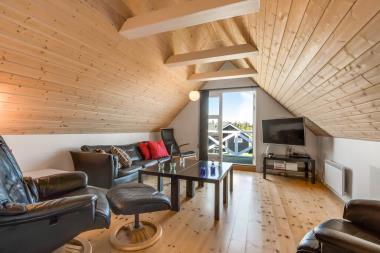 På første sal er der en hyggelig opholdsstue med flotte møbler, stereoanlæg med CD og en 4K-fladskærm med fibernet-TV, der giver adgang til danske og tyske kanaler.