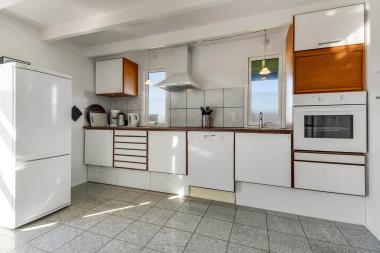 Feriehuset er smagfuldt og personligt indrettet med lyse vægge og en dejlig atmosfære. I stueetagen finder du en rummelig spisestue samt et flot, veludstyret køkken med glaskeramisk komfur, opvaskemaskine, mikroovn og en lille fryser. Her er også husets brændeovn og varmepumpe placeret, så du kan nyde den behagelige varme – begge løsninger bidrager samtidig til en lavere forbrugsregning.