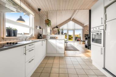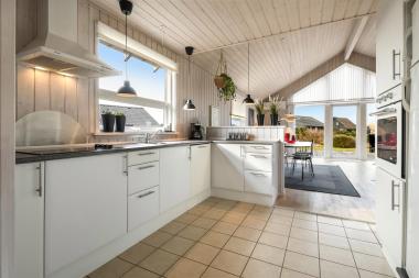 Indbydende og velindrettet feriehus på 103 m2. Huset byder på entré med plads til overtøj. Køkkenhjørne og stue glider let og naturligt sammen, og derfor kan familien hygge sig sammen, når der skal laves noget i køkkenet. Køkkenhjørnet er veludstyret med bla. keramiske kogeplader, indbygningsovn, mikroovn, emhætte, opvaskemaskine, køleskab med fryseboks og alt i service og køkkengrej. Mod opholdsstuen afgrænses køkkenhjørnet at en lille halvvæg, hvor der er placeret 2 barstole, som gør det nemt at samtale og hygge med et glas vin, når måltiderne forberedes. På vej ind i stuen går man forbi et dejligt spisebord, som er praktisk placeret lige ved køkkenhjørnet. Opholdsstuen er indrettet med pæne lædermøbler, TV med danske og tyske kanaler, gratis internet, DVD/DC/Radio. En dejlig brændeovn og varmepume sørger for ekstra hygge samt varme til de rå dage ved Vesterhavet. Huset byder på 2 badeværelser. Nyd det store, flotte badeværelse med spabad, gulvvarme, bruseniche i glassten, toilet, håndvask, og klinkegulv med gulvvarme. Lige ved siden af det store badeværelse, er et lille ekstra rum. Her er vaskemaskine og tørretumbler placeret, ligesom der er adgang til husets 2-3 personers sauna.Gæstetoilet med med toilet, håndvask og klinkegulv med gulvvarme. 3 rummelige soverum (1DS, 1DS, 2ES). Det samme trægulv går igen i alle soverum. Køkkenhjørne med klinkegulv. I alle rum er der god plads og masser af luft. Opholdsrum er bygget i kip, hvilket gør, at der også er 1 hems, som kan bruges til opbevaring eller leg for børn og barnlige sjæle. Barneseng og højstol til de mindste. Har man el-bil eller en Plug-In hybrid, så er der ved Ladeboks til Type 2 ladestik, der kan lade op til 11 kWh. Ladekabel skal man selv medbringe. Ikke-ryger hus. Husdyr ikke tilladt.