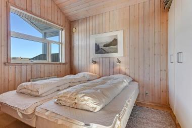 Dejligt indrettet feriehus i træ, god møblering. Beliggende på en naturgrund tæt ved Vesterhavet. Stue: Brændeovn, fladskærm med parabol (kun tyske kanaler), stereoanlæg med CD. Køkken: El-komfur, køleskab med frostboks, mikroovn, opvaskemaskine. Trådløs Internet. 3 soverum: 1DS + 2S + 2S. Badeværelse: Toilet, bruser, gulvvarme, spa og sauna. Vaskemaskine. Terrasse med havemøbler og grill. Husdyr ikke tilladt. Rygning ikke tilladt.