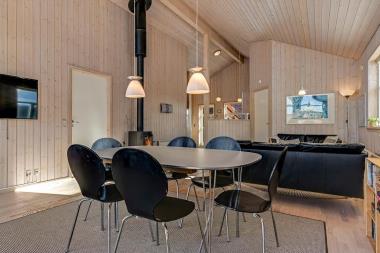 Dejligt indrettet feriehus i træ, god møblering. Beliggende på en naturgrund tæt ved Vesterhavet. Stue: Brændeovn, fladskærm med parabol (kun tyske kanaler), stereoanlæg med CD. Køkken: El-komfur, køleskab med frostboks, mikroovn, opvaskemaskine. Trådløs Internet. 3 soverum: 1DS + 2S + 2S. Badeværelse: Toilet, bruser, gulvvarme, spa og sauna. Vaskemaskine. Terrasse med havemøbler og grill. Husdyr ikke tilladt. Rygning ikke tilladt.
