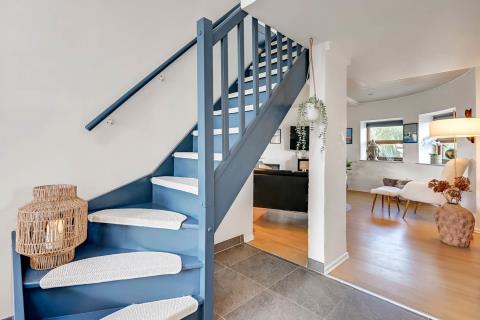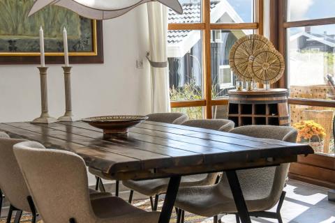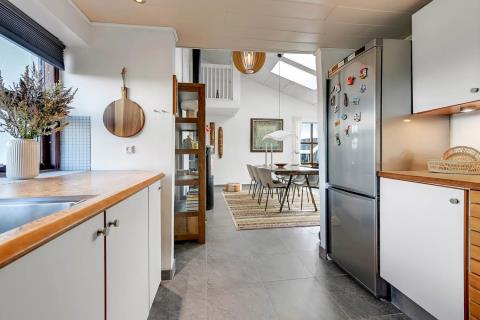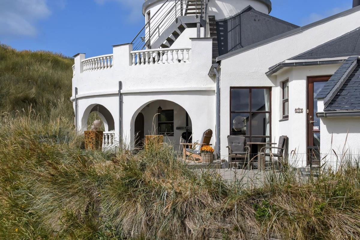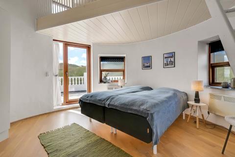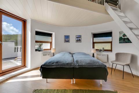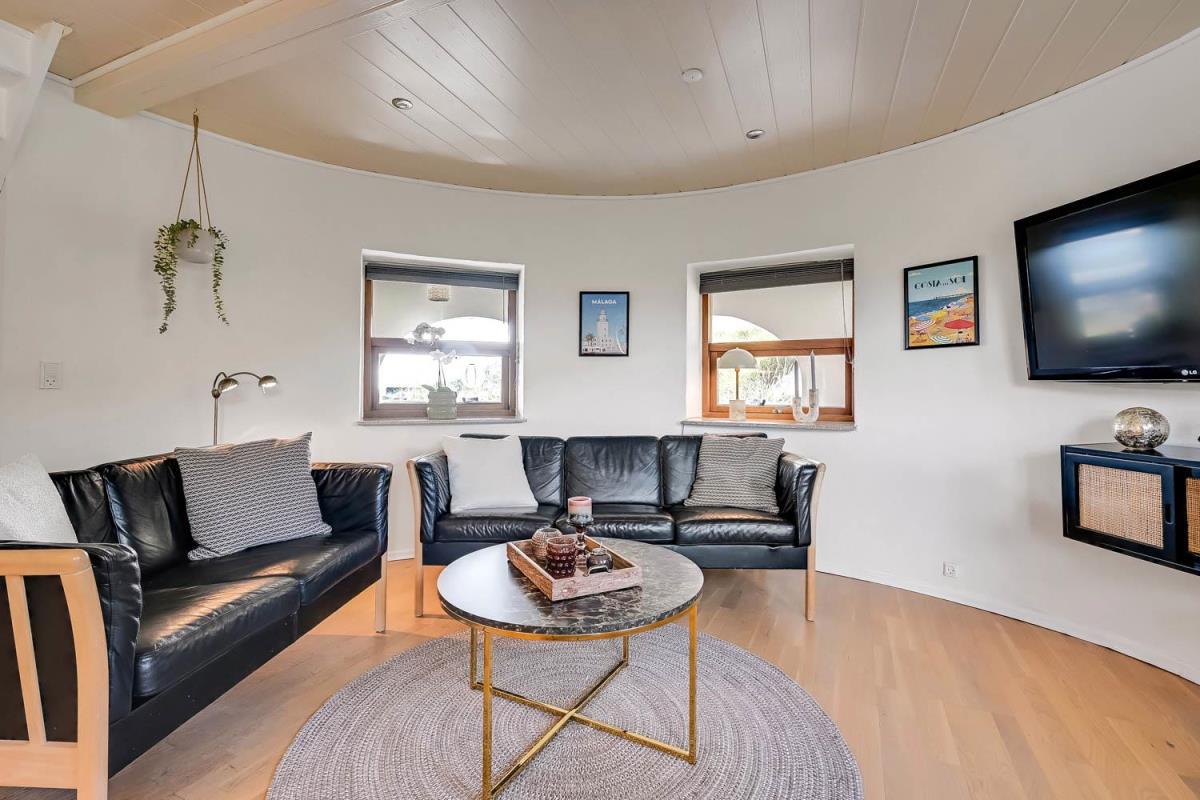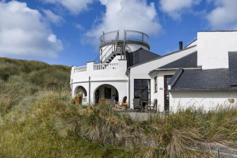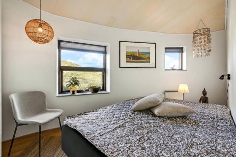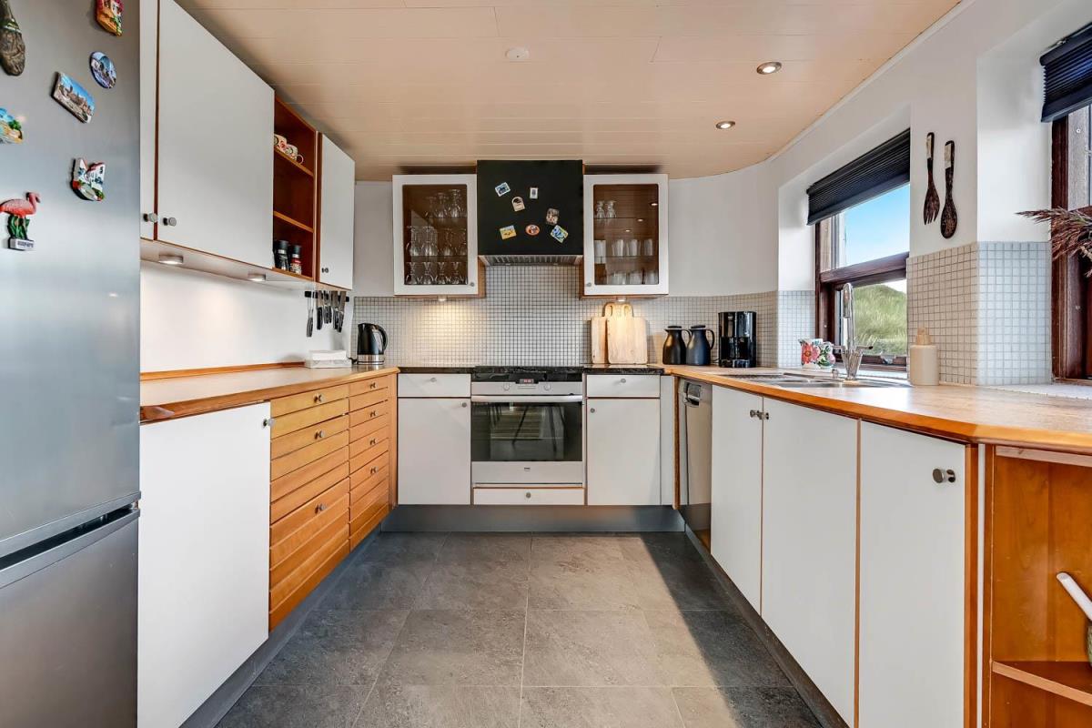 Allerede når bilen når grusvejen som fører op til huset kan man se at både hus og beliggenhed er noget ganske særligt. Dette hus er så specielt og flot at det skal opleves. En flot entre byder velkommen og her er der rig mulighed for at hænge sit overtøj op, desuden står husets vaskemaskine og tørretumbler også her. Fra entreen kommer man ind i en fordelergang her kan man få adgang til et af husets 2 badeværelser som er meget stort, her er der toilet, håndvask, bruser, gulvvarme samt et spabad og her er den spanske byggestil også kommet til udtryk. Ved siden af badeværelset er der et soveværelse med 1 DS og for enden af gangen er der et soveværelse med 1 DS. Fra gangen kommer man ind i spisestue/køkken. Her er der højt til loftet og herfra er der udgang til den overdækkede terrasse. Stort flot køkken med alt i service og kogegrej. Der er induktionskogeplade, indbygningsovn, emhætte, opvaskemaskine, mikroovn samt et køle-/fryseskab. Spisestuen er indrettet med et spisebord og her er der desuden en brændeovn, som giver en behagelig varme også på de kolde dage, fra spisestuen er der indgang til husets opholdsstue som er indrettet med gode lædermøbler, F-TV med fibernet TV med danske og tyske programmer. Fra spisestuen er der en lille trappe op til huset master bedroom med en DS og herfra er der indgang til det andet badeværelse i huset som er indrettet med toilet, håndvask, bruser samt adgang til husets sauna. Fra dette soveværelse er der udgang til en åben terrasse hvorfra man kan nyde udsigten over klitterne, herfra kommer man via en trappe op til den store runde terrasse som er ovenpå selve tårnet. Her er udsigten fantastisk ud over Vesterhavet og hele området omkring Vrist. Har man el-bil eller en Plug-In hybrid, så er der ved ladeboks til Type 2 ladestikIkke rygerhus. 1 husdyr er tilladt.