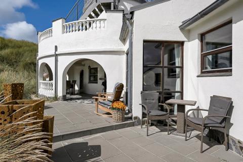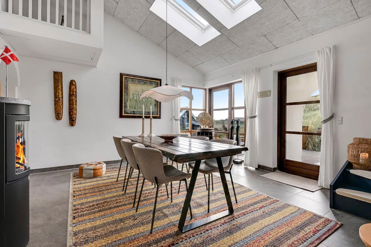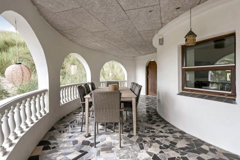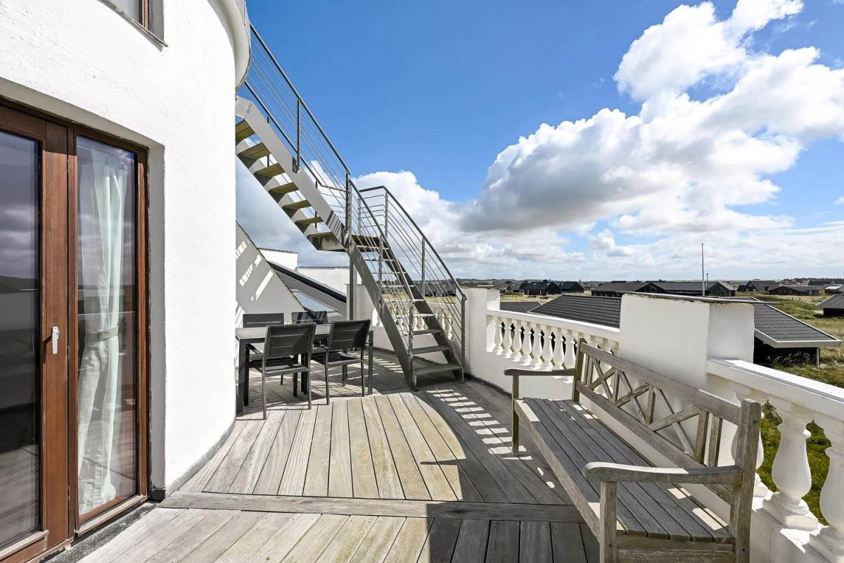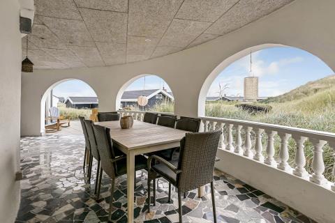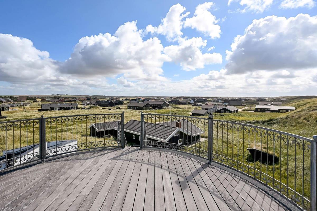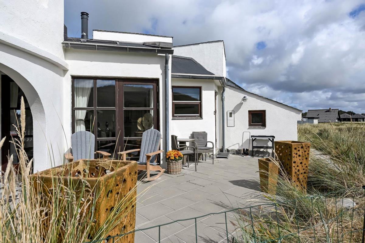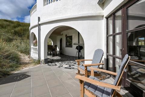 Huset er beliggende på en klitgrund helt op af diget ved Vesterhavet og har en af de bedste beliggenheder i området. Huset har flere terrasser og den som ligger, i stueplan er overdækket og her kommer den spanske stil helt til udtryk, her er selvfølgelig havemøbler og grill og det perfekte sted at opholde sig også når temperaturen udenfor er høj så er denne overdækkede terrasse dejlig sval. Fra 1. sal er der udgang til endnu en terrasse og herfra er der en flot udsigt til klitterne og området der går en udvendig trappe op til toppen af tårnet hvor den sidste terrasse befinder sig og herfra har man en storslået udsigt over Vesterhavet og hele Vrist området. Fra huset er der blot 50 m til stranden ved Vesterhavet som hver dag byder på nye oplevelser. Der er mange forskellige aktiviteter man kan foretage sig ved stranden, bade, svømme, fiske, samle sten og rav, bygge sandslotte eller flyve med drager og meget mere. I køreafstand fra huset ligger fiskerbyen Thyborøn som er en hyggelig by med mange gode spisesteder, butikker og attraktioner, her er også de bedste muligheder for at købe frisk fisk med hjem. Kører man i den anden retning kommer man til den gamle handelsby Lemvig som også har flere gode forretninger og spisesteder, her er ligeledes en dejlig havnepromenade hvor der er en lille legeplads til de mindste børn. Dette hus er til de gæster som ønsker sig det helt unikke i deres ferie med en beliggenhed så tæt på stranden som muligt.