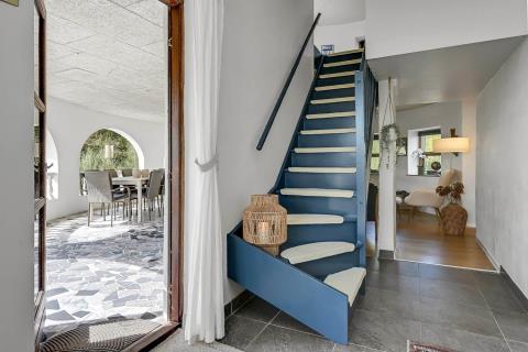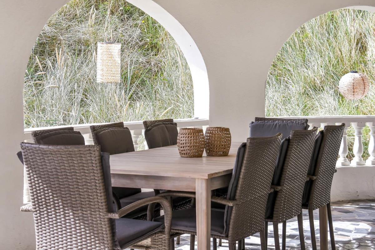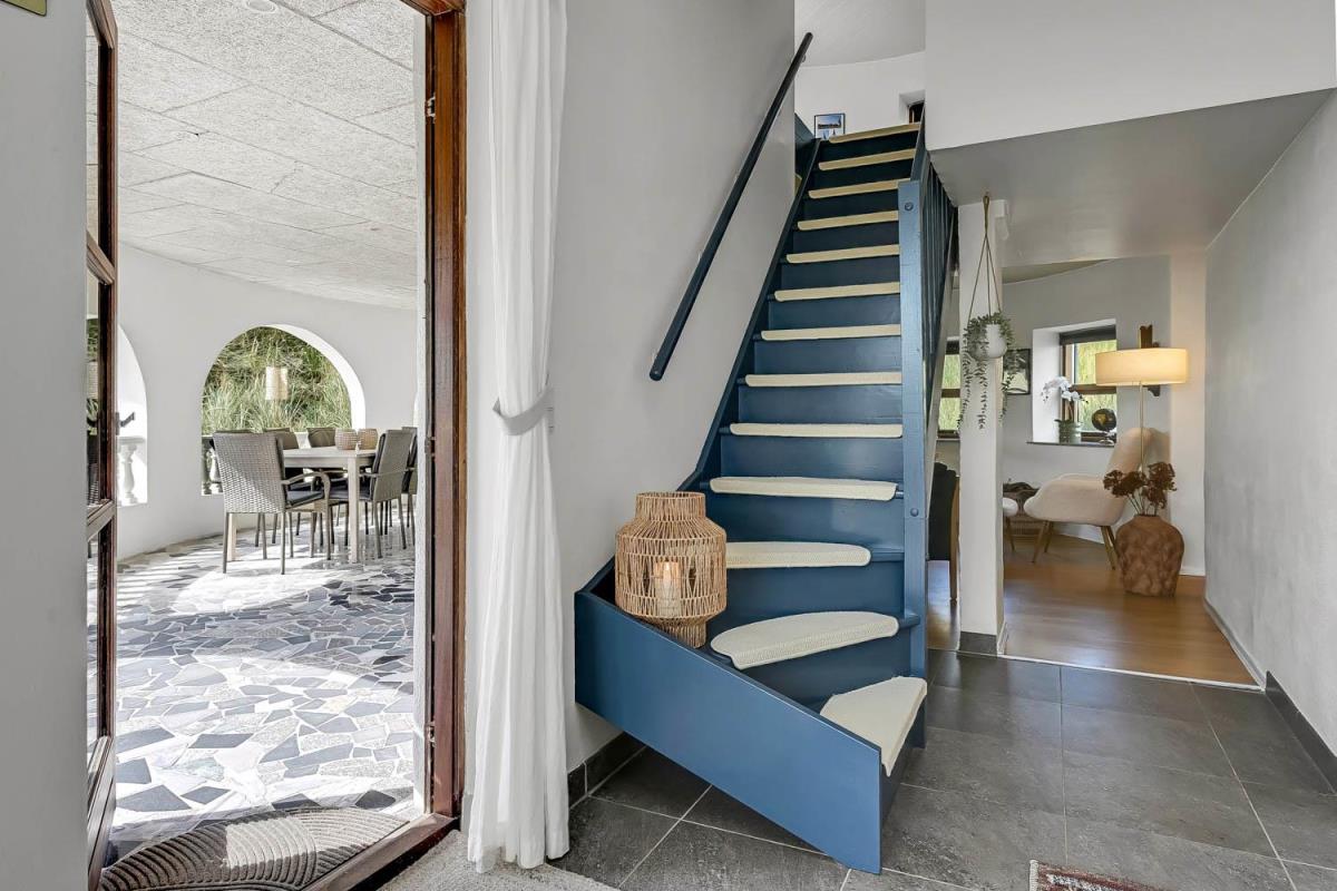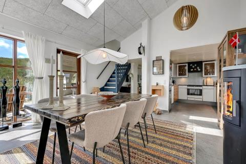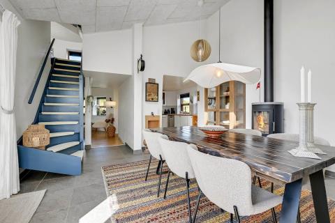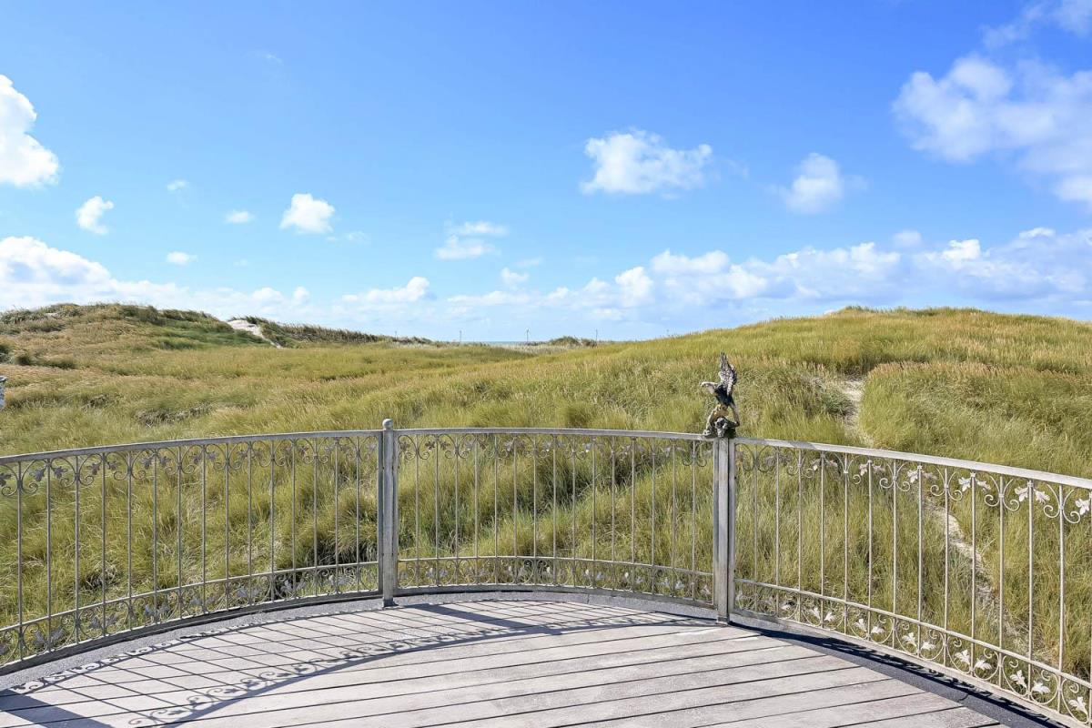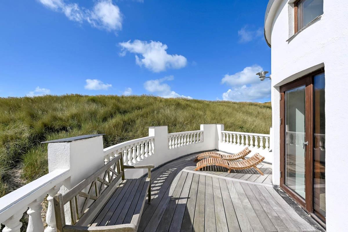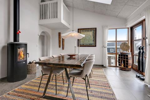 Huset er beliggende på en klitgrund helt op af diget ved Vesterhavet og har en af de bedste beliggenheder i området. Huset har flere terrasser og den som ligger, i stueplan er overdækket og her kommer den spanske stil helt til udtryk, her er selvfølgelig havemøbler og grill og det perfekte sted at opholde sig også når temperaturen udenfor er høj så er denne overdækkede terrasse dejlig sval. Fra 1. sal er der udgang til endnu en terrasse og herfra er der en flot udsigt til klitterne og området der går en udvendig trappe op til toppen af tårnet hvor den sidste terrasse befinder sig og herfra har man en storslået udsigt over Vesterhavet og hele Vrist området. Fra huset er der blot 50 m til stranden ved Vesterhavet som hver dag byder på nye oplevelser. Der er mange forskellige aktiviteter man kan foretage sig ved stranden, bade, svømme, fiske, samle sten og rav, bygge sandslotte eller flyve med drager og meget mere. I køreafstand fra huset ligger fiskerbyen Thyborøn som er en hyggelig by med mange gode spisesteder, butikker og attraktioner, her er også de bedste muligheder for at købe frisk fisk med hjem. Kører man i den anden retning kommer man til den gamle handelsby Lemvig som også har flere gode forretninger og spisesteder, her er ligeledes en dejlig havnepromenade hvor der er en lille legeplads til de mindste børn. Dette hus er til de gæster som ønsker sig det helt unikke i deres ferie med en beliggenhed så tæt på stranden som muligt.