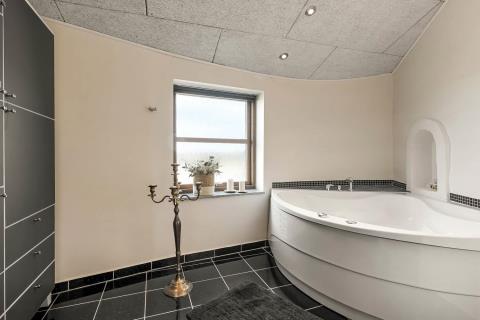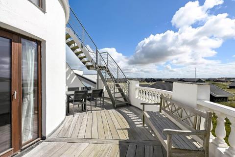 Dette feriehus som er opført i spansk byggestil og med et tårn, hvor der er en rund terrasse, og heroppe fra, er der udsigt over Vesterhavet, har en af de bedste beliggenheder i området, helt op af diget i Vrist. Huset har plads til 6 personer og 1 husdyr er tilladt. Der er gratis internetadgang.