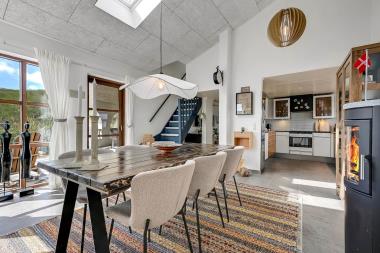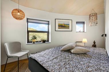 Allerede når bilen når grusvejen som fører op til huset kan man se at både hus og beliggenhed er noget ganske særligt. Dette hus er så specielt og flot at det skal opleves. En flot entre byder velkommen og her er der rig mulighed for at hænge sit overtøj op, desuden står husets vaskemaskine og tørretumbler også her. Fra entreen kommer man ind i en fordelergang her kan man få adgang til et af husets 2 badeværelser som er meget stort, her er der toilet, håndvask, bruser, gulvvarme samt et spabad og her er den spanske byggestil også kommet til udtryk. Ved siden af badeværelset er der et soveværelse med 1 DS og for enden af gangen er der et soveværelse med 1 DS. Fra gangen kommer man ind i spisestue/køkken. Her er der højt til loftet og herfra er der udgang til den overdækkede terrasse. Stort flot køkken med alt i service og kogegrej. Der er induktionskogeplade, indbygningsovn, emhætte, opvaskemaskine, mikroovn samt et køle-/fryseskab. Spisestuen er indrettet med et spisebord og her er der desuden en brændeovn, som giver en behagelig varme også på de kolde dage, fra spisestuen er der indgang til husets opholdsstue som er indrettet med gode lædermøbler, F-TV med fibernet TV med danske og tyske programmer. Fra spisestuen er der en lille trappe op til huset master bedroom med en DS og herfra er der indgang til det andet badeværelse i huset som er indrettet med toilet, håndvask, bruser samt adgang til husets sauna. Fra dette soveværelse er der udgang til en åben terrasse hvorfra man kan nyde udsigten over klitterne, herfra kommer man via en trappe op til den store runde terrasse som er ovenpå selve tårnet. Her er udsigten fantastisk ud over Vesterhavet og hele området omkring Vrist. Har man el-bil eller en Plug-In hybrid, så er der ved ladeboks til Type 2 ladestikIkke rygerhus. 1 husdyr er tilladt.