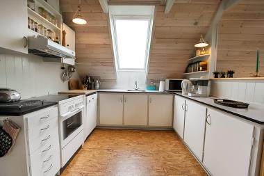 Dejlig køkken som er kombineret med stuen, på den anden side af køkkenet står spisebordet og i stuen er der polstermøbler, F-TV med DR og TV2 programmer, parabol (kun tyske programmer) samt Chromecast med mulighed for streaming af radio / TV / Apps som du selv har et abonnement til, brændeovn og varmepumpe som begge er medvirkende til en dejlig varme og en billigere el-regning. Fra stuen er der en trappe op til 1. sal hvor der et opholdsrum med spisebord og kurvemøbler, herfra er der en god udsigt over området. Køkkenet er med el-komfur, køleskab med frostboks, opvaskemaskine og mikroovn. Badeværelse med toilet, håndvask og bruser. 2 soverum hver med 1 ¾ seng. Der er gulvtæpper i værelser og i stuen. Vaskemaskine. Ikke rygerhus.