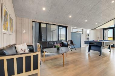 Midt i huset er aktivitetsrummet placeret. Rummet fungerer også som fordeler rum til 3 af husets soveværelser samt det store badeværelse. I rummet står et poolbord, som også kan laves om til et bordtennisbord, bløde, nye lædermøbler samt endnu et smart-TV magen til det første og med samme muligheder. Udgang til terrasseanlæg er en selvfølge og den installerede varmepumpe hjælper til at spare på omkosteningerne til opvarmning og sørger for et super indeklima. Det store, rummelige badeværelse har spabad, direkte adgang til saunaen, toilet, håndvask, klinkegulv med gulvvarme og bruseniche med glasdør.