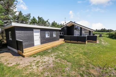 Der er en lækker stor terrasse, som er delvis overdækket. Her er der havemøbler, lounge møbler og 2 solvogne, alle med hynder til, som er i skuret i en hyndeboks. Der er også en kul Grill og grill starter. Der er også en mindre delvis overdækket terrasse foran huset. Her står morgensolen op, hvilket gør det dejligt at sidde og få morgenkaffe om sommeren. Der er kun 250 meter til Vesterhavet og den brede strand, hvor der altid er masser af plads til aktiviteter alt efter sæsonen. Man kan fiske hele året rundt og solbade om sommeren. Drageflyvning er altid muligt og de små elsker at bygge i sandet. Vandreture langs havet er også utroligt populært og her kan man se nogle af de mest fantastiske solnedgange over Vesterhavet.Dette dejlige store rummelige sommerhus ligger kun 250 meter fra Vesterhavet med dejlig sydvestvendt terrasse. Usædvanligt for området så er der højere bevoksning omkring huset – dette giver læ og gør beliggenheden idyllisk. Huset har 1 badeværelse + 1 gæstetoilet samt hele 3 soveværelser og en sovehems. Her er gratis trådløs internet. Husdyr og rygning er ikke tilladt.