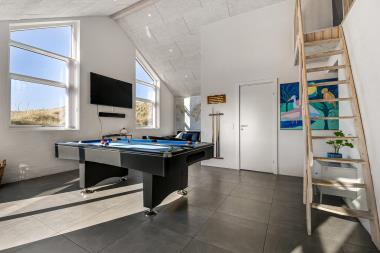 Nybygget luksus hus i første række til Vesterhavet med klitudsigt. Aktivitets- og wellnessferiehus med pool, spa, sauna, gratis W-lan og aktivitetsrum med kombineret poolbord og bordtennis. Et moderne og meget æstetisk feriehus med alle tænkelige faciliteter. Et hus med god plads til hele familien og kun 75 m til Vesterhavet. Nyd husets mange muligheder eller gå en tur ved Vesterhavet.