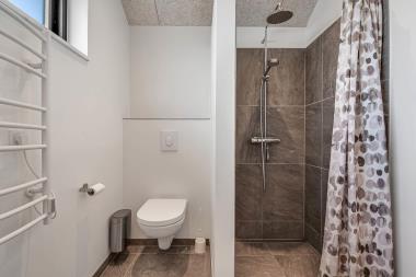 Huset råder over to badeværelser, som begge er indrettet med toilet, håndvask, bruser og gulvvarme. I det ene badeværelse findes også et spabad. Huset har fire gode soverum: 2S + 1DS + 1DS + 1DS desuden er der fra gangen via en stige adgang til en hems med to sovepladser. I entreen er vaskemaskine og tørretumbleren placeret, og her er der også god plads til at hænge overtøjet.