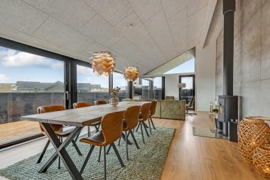 Dette nybyggede feriehus er på hele 110m2 og er i særdeleshed veludnyttet med bl.a. stort køkken/alrum kombineret med stuen. Det giver følelsen at, man som familie er samlet uanset om en person er i køkkenet og resten af familien slænger sig i den bløde sofa. Der er højt til himlen, huset har nemlig loft til kip, som er med til at gøre huset ekstra rummeligt. Det store vinduesparti mod klitterne giver et fantastisk lysindfald og fungerer som et levende maleri.