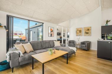 Husets hjerte er det store, åbne opholdsrum, hvor køkken, spiseplads og stue går ud i ét. Her er loft til kip, store vinduer og masser af naturligt lys, og det er netop her, man for alvor mærker feriehusets særlige atmosfære. Det moderne køkken er fuldt udstyret med alt, hvad man har brug for – og lidt til – og ligger i åben forbindelse med spisepladsen og den indbydende stue, som er møbleret med lækre kvalitetsmøbler og udstyret med TV, Chromecast og både danske og tyske kanaler. Her er der rigelig plads til samvær, afslapning og hygge – uanset om det er til en god film, en brætspilsaften eller bare at nyde stilheden og udsigten. Fra stuen er der adgang til master bedroom med eget toilet/bad.