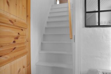 Fra gangen fører en charmerende, men stejl trappe op til 1. sal, hvor en ekstra hyggelig stue venter. Her kan du slappe af i polstrede møbler foran TV’et. På samme etage finder du også et skønt soveværelse med en dobbeltseng. I stueetagen ligger husets andet soveværelse – ligeledes med en dobbeltseng.
