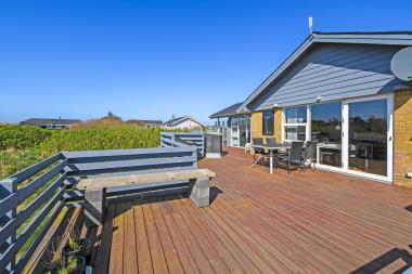 Hust ligger på en ca. 1.000 m2 stor grund. Fra opholdsstuen og fra udestuen er der udgang til et fantastisk, indhegnet terrasseanlæg. Der er fantastisk læ afskærmning af glas så man altid kan sidde i læ samtidig med man nyder udsigten. Der er masser af havemøbler samt 2 liggestole og grill på terrassen. På terrassen er der også lagt flotte pyntesten m.m. og der findes altid en dejlig lækrog samt en plads i solen på dette unikke terrasseanlæg. Nyd en gåtur til Vesterhavet som kun ligger ca. 500m fra huset eller vejen forbi områdets indkøbsmuligheder. Indenfor kort køreafstand nås både den aktive handelsby i Lemvig med flere specialbutikker eller den unikke fiskerby Thyborøn, som udover den aktive fiskerihavn også byder på badestrand og op til flere aktivitetstilbud, som alle er et besøg værd.