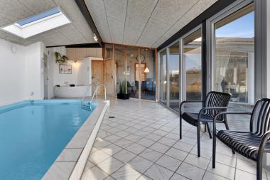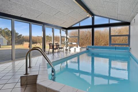 Dette feriehus med egen swimmingpool er beliggende på en naturgrund tæt på Vesterhavet. Huset er bygget i 1991 og er løbende vedligeholdt inde og ude. Der er gynge, sandkasse og legehus til børnene. Stuen fremtræder hyggelig. I poolrummet er der panoramavinduer til 3 sider. Husets indretning er velegnet til 2 familier. Stue: Brændeovn, F-TV med parabol (kun tyske kanaler), stereoanlæg med CD.Bordfodbold. Gratis internetadgang. Køkken: El-komfur, køleskab med frostboks, mikroovn, opvaskemaskine. 4 soverum: 1DS + 1DS + 2S + 2S. Hems: 2 sovepladser. Barneseng og højstol. Badeværelse: Toilet, håndvask, bruser, gulvvarme, sauna. Gæstetoilet: Toilet, håndvask, bruser, gulvvarme. Swimmingpool, spabad, vaskemaskine, tørretumbler. Der er varmepumpe i huset. Poolen opvarmes via varmepumpe. Terrasse med havemøbler og grill.