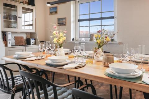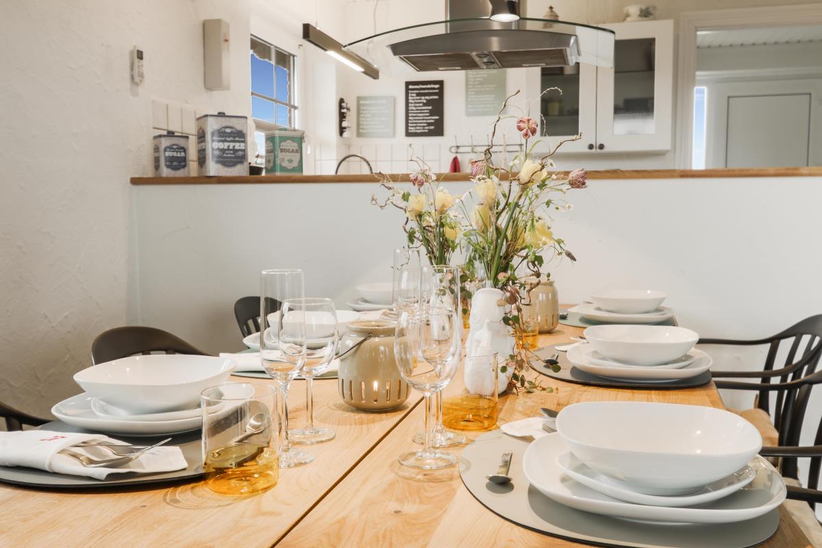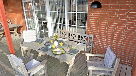 Et særligt højdepunkt er de tre terrasser i forskellige verdenshjørner – herunder en delvist overdækket terrasse med havemøbler, liggestole og grill – ideelle til at nyde solen hele dagen eller finde læ for vinden. En af terrasserne er lukket og har direkte adgang til grunden. Også jeres firbenede venner er hjerteligt velkomne: I må medbringe op til 3 hunde.