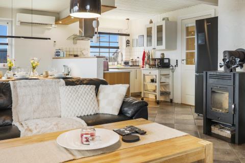 Den rummelige opholdsstue med brændeovn og gulvvarme indbyder til hyggelige stunder, mens spabad og sauna lover ren afslapning. Det veludstyrede køkken opfylder alle behov, og underholdningen er sikret med streaming-TV og spillekonsoller.