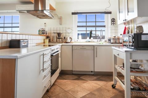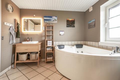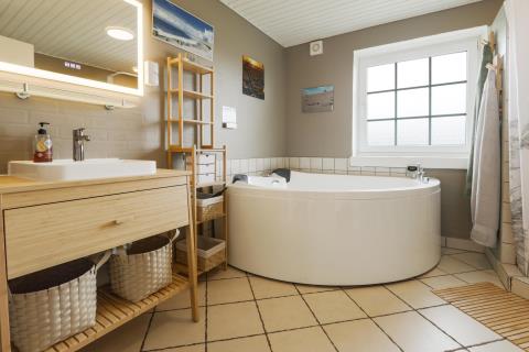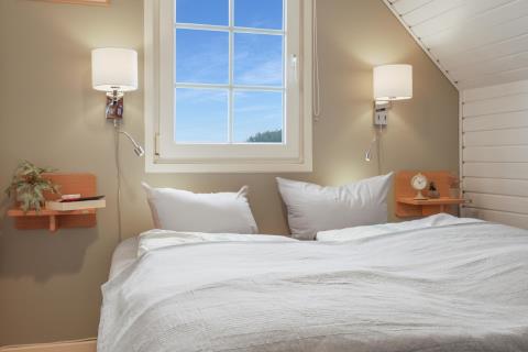 Fire soveværelser i elegant hotelstil – to med dobbeltsenge og to med enkeltsenge – samt nye kvalitetssenge sikrer afslappende nætter. Fra to af soveværelserne på første sal er der adgang til en lille balkon, hvor I kan nyde udsigten og lyden af havet. I både soveværelserne og badeværelset sørger infrarøde varmeelementer med behagelig strålevarme for et særligt komfortabelt indeklima.