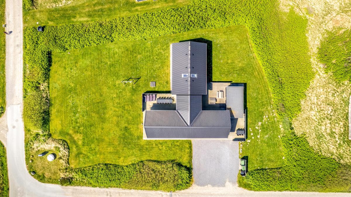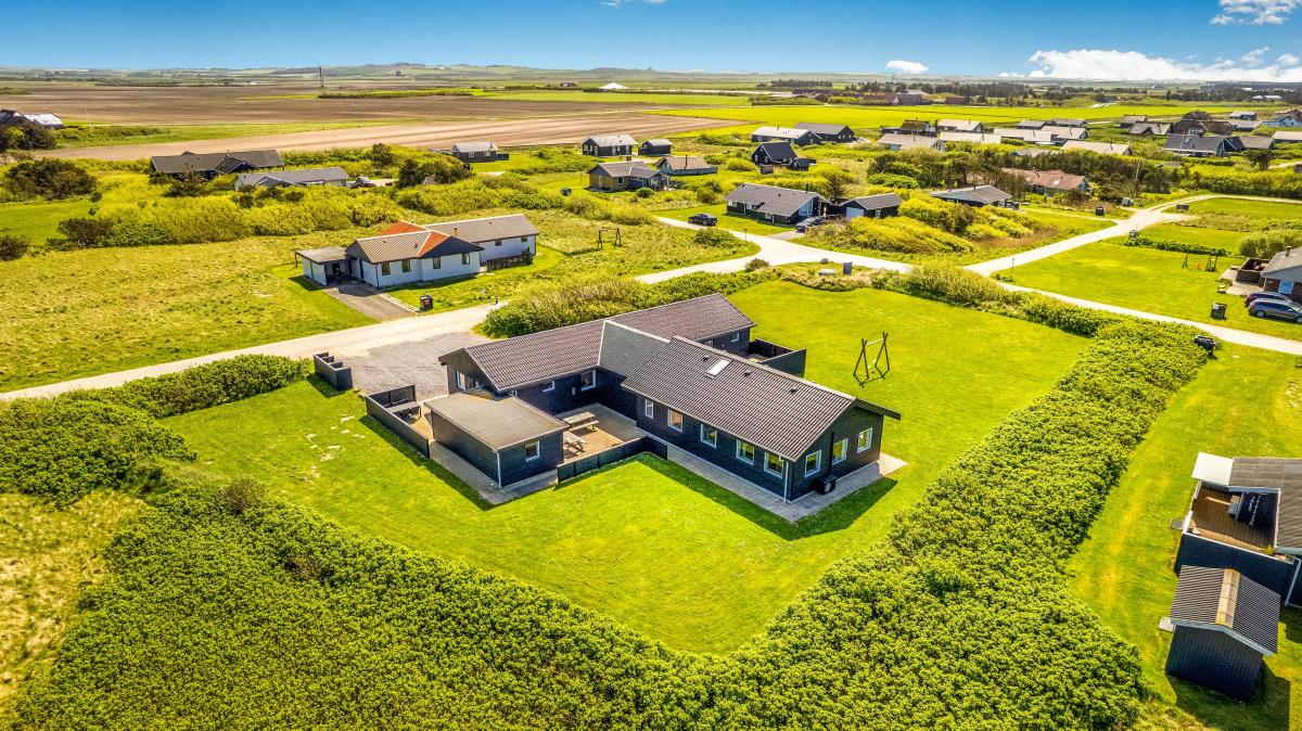 Feriehuset er beliggende på en 2.674m2 stor naturgrund kun 400 meter fra Vesterhavet. Fra poolrummet er der direkte udgang til husets største terrasse. Den er 40 m2 stor og er lukket. Terrassen er veludstyret med havemøbler, solvogne, hynder samt grill. Der findes yderligere to terrasser rundt om huset som i alt har et flisebelagt terrasseanlæg på 100m2 . På den store naturgrund er der sandkasse med låg og gynger. Huset ligger 1.000 meter fra dagligvarebutikker samt spisemuligheder i byen Harboøre.