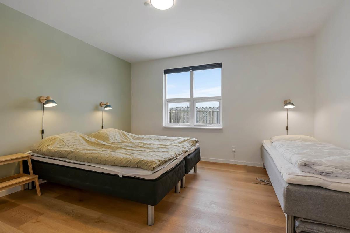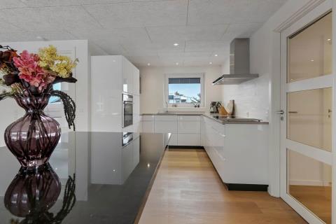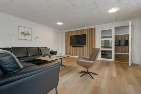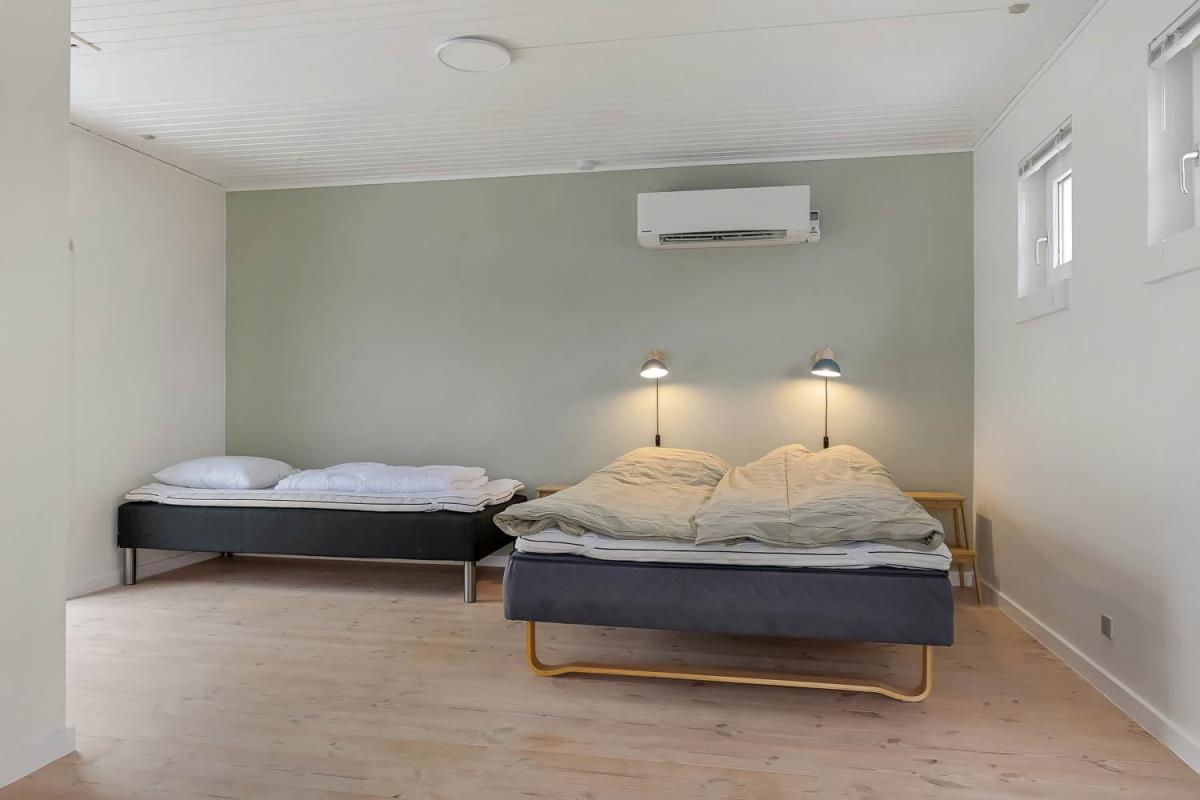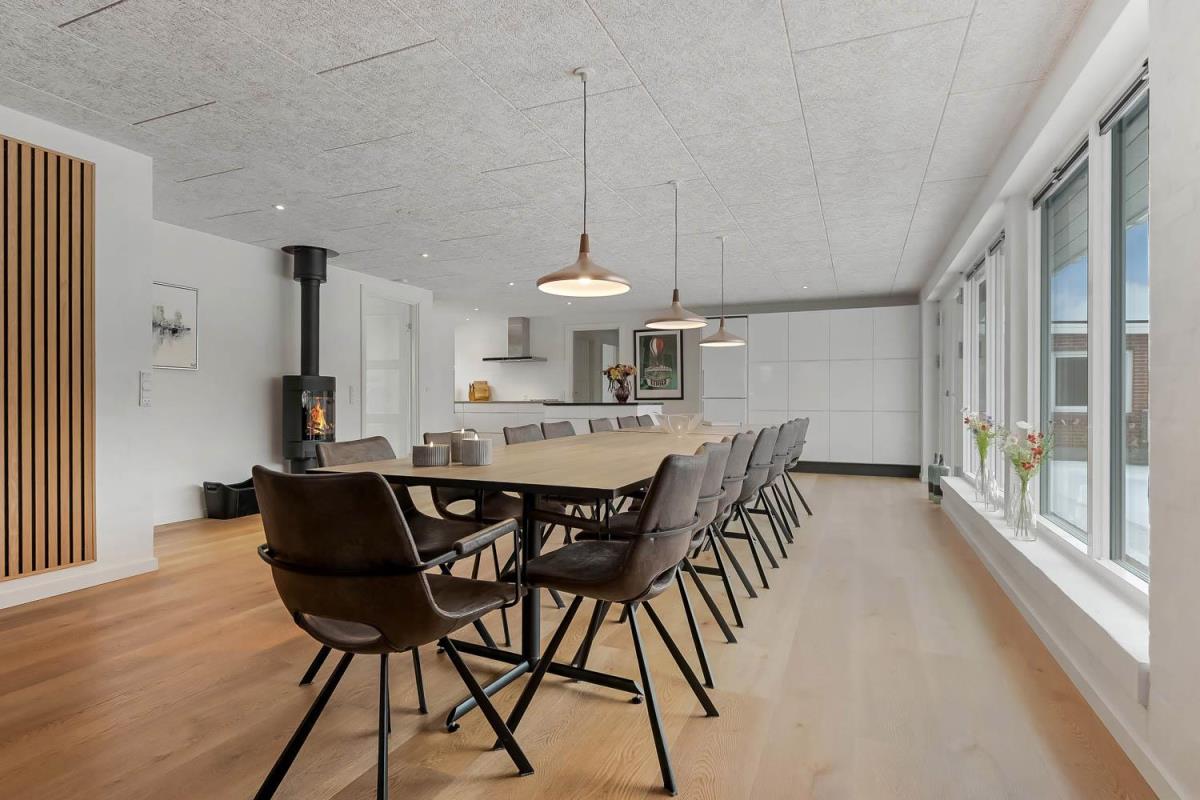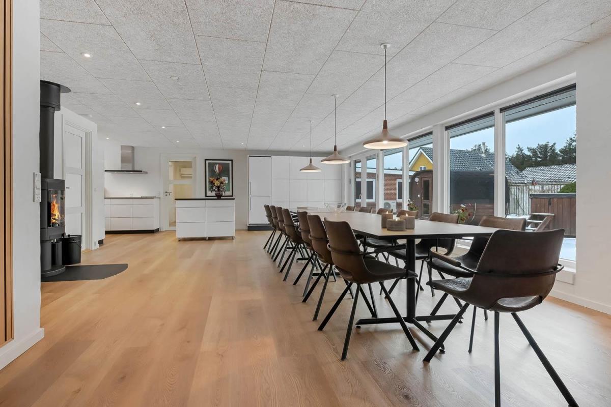 Feriehus på 240 m2. Huset er bygget i 1997 – men er i 2022 blevet totalt istandsat. Huset er minimalistisk i sit udtryk, praktisk indrettet og holdt i lyse, venlige og indbydense farver og materialer. Stor Entrè med vaskemaskine, tørretumbler og indbyggede skabe med loft til gulv låger byder velkommen. Fra entréen åbenbarer der sig et flot kombineret spisestue- og køkkenhjørne med gulvvarme. Helt nyt og indbydende køkkenhjørne med alt i service og køkkengrej, opvaskemaskine, keramiske kogeplader, indbygningsovn, emhætte Køle- / fryseskab, mikroovn. I køkkenafdelingen er der også en helt ny brændeovn ligesom den første af huset i alt 3 varmepumper hænger. Alt sammen optimeringer som gør huset særdeles energioptimeret og billigt i forbrug. En forlængelse af køkkenet er det store spisebord praktisk placeret, hvor der er rigeligt plads til alle gæster. Opholdsstuen med, nye lækre lædermøbler, Smart-TV med danske og tyske programmer samt mulighed for streaming af TV / radio / Apps via Chromecast. I huset er der 6 gode soverum med gode nye senge (1DS, 1DS, 1DS, 1DS, 1DS+1ES, 1DS+1ES). Flotte og lækre badeværelser med klinkegulv med gulvvarme, toilet, håndvask og bruser. Ekstra badeværelse med klinkegulv med gulvvarme, toilet, håndvask og bruser. Ikke ryger hus. Max 1 husdyr tilladt.