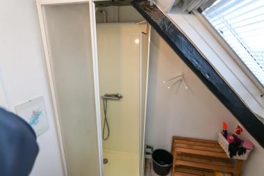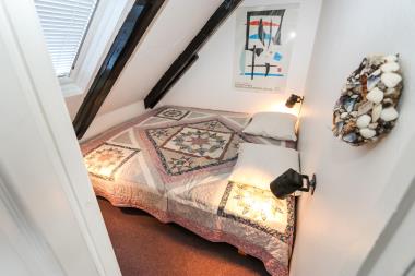 Husets 1. sal er indrettet som en separat lejlighed. Bag hovedhuset går en trappe til 1. sal. Her er der en pæn fuldt udstyret lejlighed. Opholdsstue med polstermøbler, TV med danske og tyske kanaler, spisebord og køkkenhjørne med elektrisk komfur med glaskeramiske kogeplader og håndvask. Soveværelse (1DS) Mindre badeværelse med toilet, bruser og håndvask. Udgang til dejlig altan med bænkesæt og pragtfuld klitudsigt og udsigt over området.