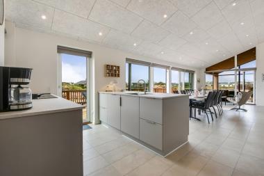 Køkkenet er moderne og funktionelt med ovn, keramisk komfur, mikroovn, kaffemaskine og køle-/fryseskab – alt, hvad I har brug for til feriens måltider.