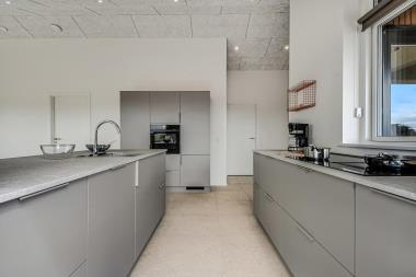 Køkkenet er moderne og funktionelt med ovn, keramisk komfur, mikroovn, kaffemaskine og køle-/fryseskab – alt, hvad I har brug for til feriens måltider.