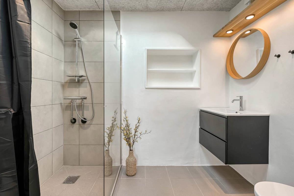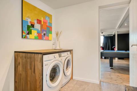 Der er to flotte badeværelser, begge centralt placeret og indrettet med toilet, håndvask og bruser. Skulle der opstå behov for tøjvask under opholdet, står både vaskemaskine og tørretumbler til rådighed. Til familiens mindste gæst findes der naturligvis også en barnestol.