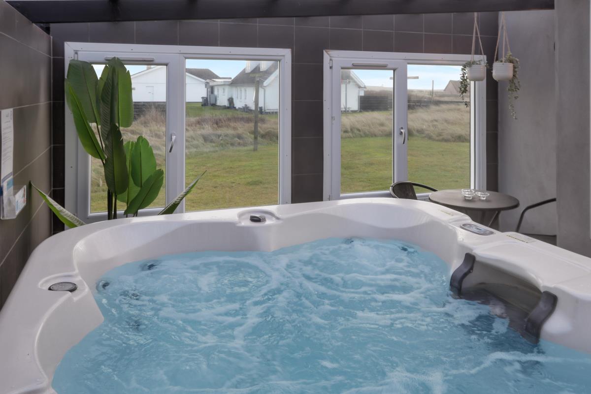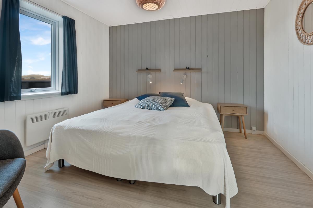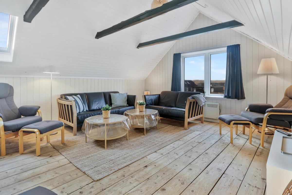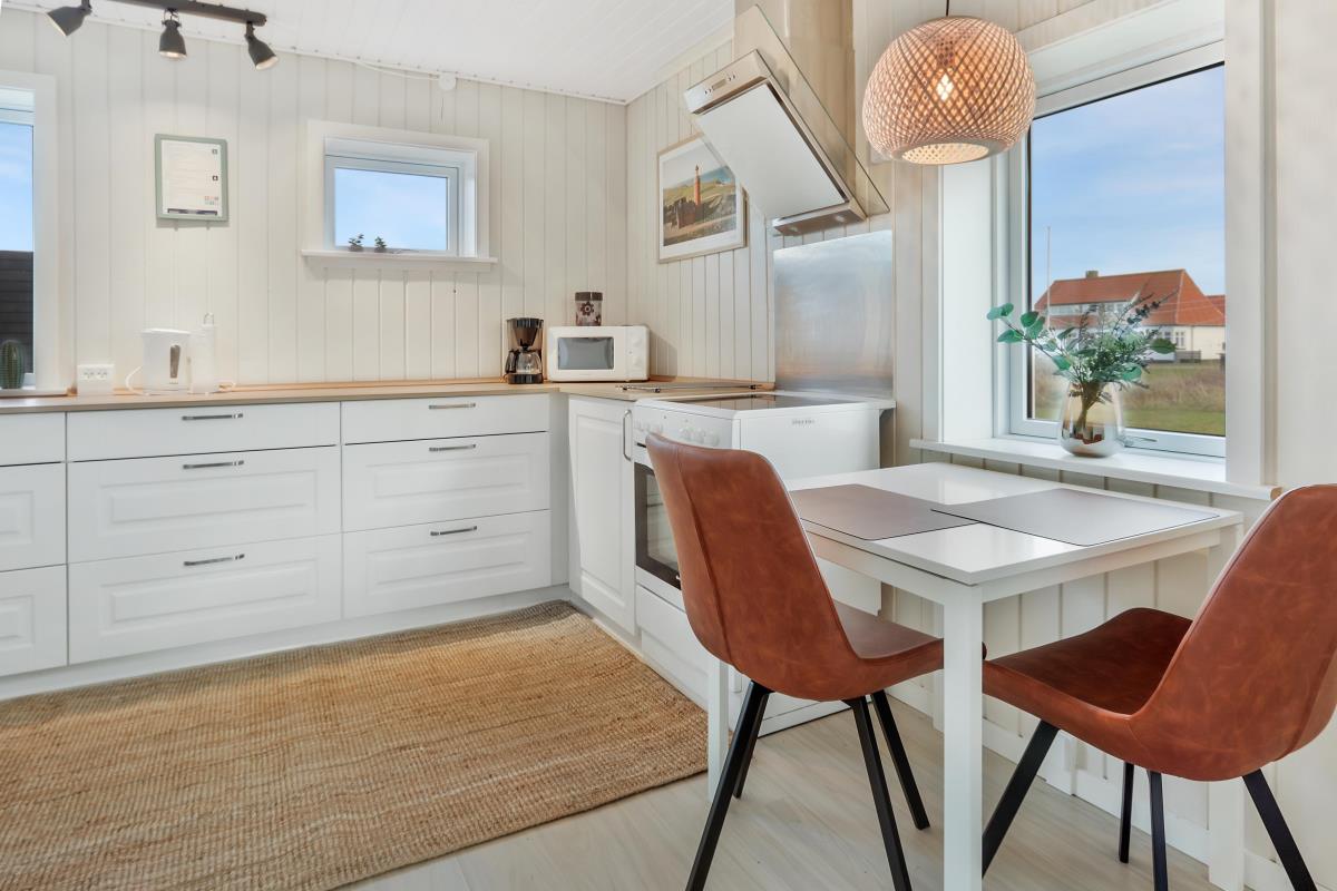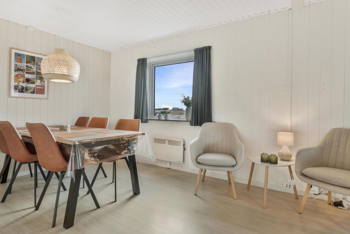 Køkkenet er helt nyt og der er bla opvaskemaskine,køle/fryse skab og mikroovn. I køkkenet findes der spiseplads til 2 personer. Dejligt badeværelse med gulvvarme og brus, badeværelset er med klinker på gulvet. Gæstetoilettet er med klinker, håndvask og gulvvarme. Sommerhuset har også en dejlig sauna. Lofter og vægge er beklædt med træ, ligeledes er gulvet af træ. Sommerhuset har to stuer og den ene er i underetagen hvor der er spisebord til 6 personer samt aktiviteter såsom bordfodbold og billardbord. Den anden stue er ovenpå og her er masser af hygge med fritlagte bjælker og med udsigt til klitterne. Her findes fladskærm med dr 1 samt DVD-afspiller og der er sofa arrangement samt brændeovn. Huset har 3 soveværelser: 1DS + 2S + 1DS. Fra soveværelset ovenpå kan man nyde udsigten udover markene. Der er vaskemaskine i baggangen. Der er installeret varmepumpe i huset og det betyder at du som gæst kan spare en del på din elvarmeregning – varmepumpen leverer op til 4 gange så meget effekt som den bruger, det betyder at for hver kilowatt-time pumpen bruger yder den varme svarende til ca. 4 kW energien udnyttes dermed langt. Udenfor er der anlagt et wellnessrum med et stort spa indeni, så man er i ly for vejret.