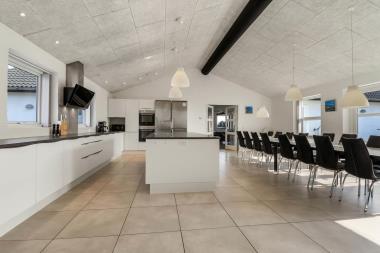 Dette fantastiske wellness luksushus er beliggende på en godt 5000m2 skøn naturgrund i Vrist kun 300 m fra Vesterhavet. Grunden ligger centralt i ferienbyen Vrist med kun 500 m til indkøb og samtidig ud til fredede naturområder. Det 339 m2 store luksushus er helt nybygget og indrettet med alle tænkelige moderne faciliteter og særdeles veludstyret for såvel en som flere familier der ønsker at tilbringe en afslappende ferie i et wellness luksushus sammen. Huset er lavet som et energi-rigtig hus, der opvarmes med jordvarme. Rummelig, lys og venlig køkken/Alrum med store vinduespartier, radio og gratis internetforbindelse i huset. Køkkenet er meget veludstyret og velindrettet med bl.a. komfurer med ovne, mikroovn samt et stort køleskab med fryser og til de små er der 2 højstole.