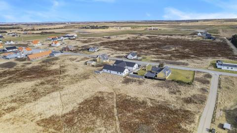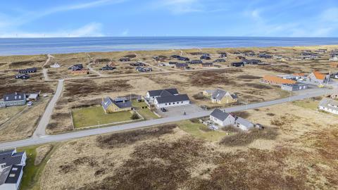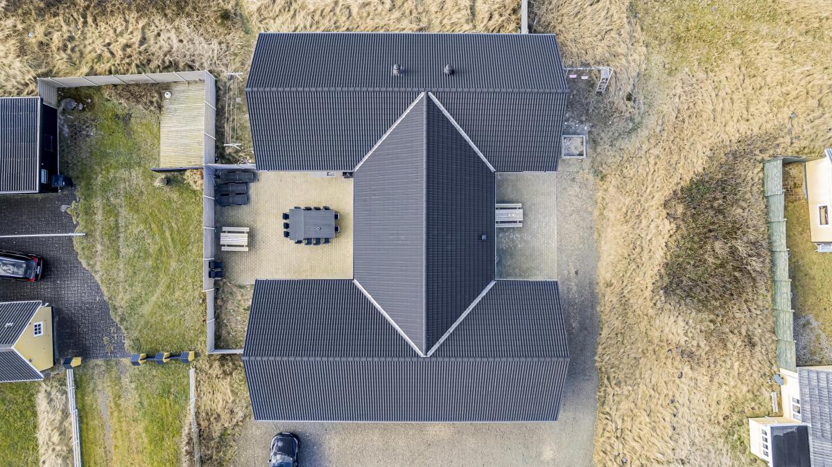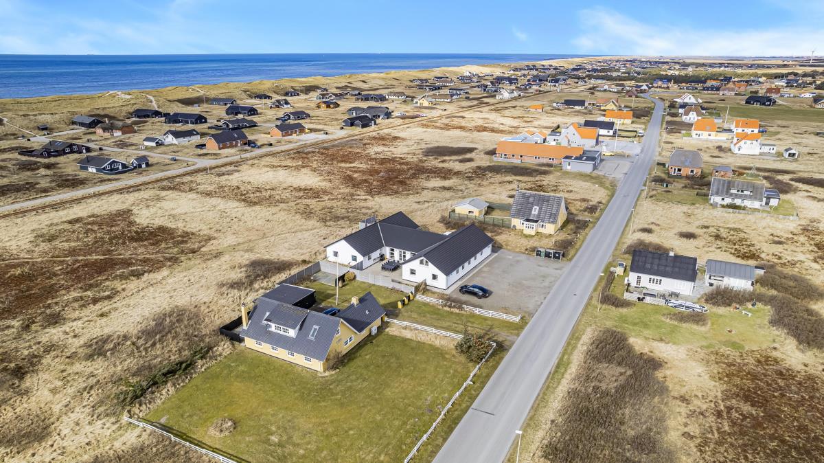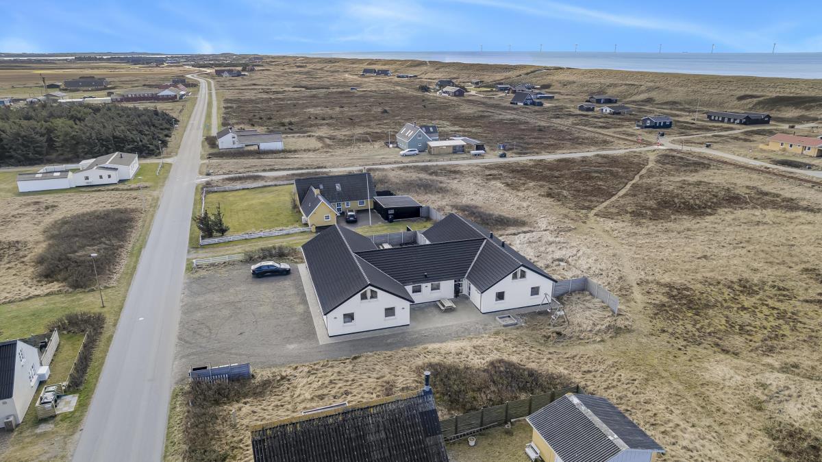 Huset er omgivet af i alt 215 m2 terrasser, hvor man altid har mulighed for at finde læ på feriens solrige dage. Her finder man naturligvis havemøbler samt helt ekstraordinært både udekøkken/fiskerenseplads og grill. Til børnene er der desuden sandkasse og gyngestativ. Dette fantastiske wellness-luksushus er beliggende på en godt 5.000 m2 skøn naturgrund i Vrist kun 300 m fra Vesterhavet. Grunden ligger centralt i ferienbyen Vrist med kun 500 m til indkøb og samtidig ud til fredede naturområder.