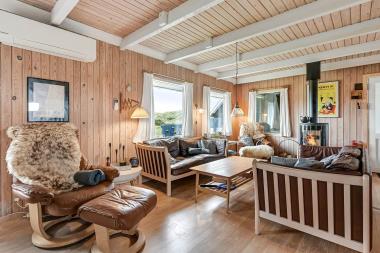 80 m2 stort feriehus med 3 soveværelser. I stueetagen er der 1 soveværelse (2ES) og på første etage er der 2 soveværelser (1DS, 2ES). Kombineret opholdsstue og køkkenhjørne med udsigt til de høje klitter ved Vesterhavet. Dejligt køkkenhjørne med bla opvaskemaskine, komfur med glaskeramiske kogeplader, emhætte, alt i service / køkkengrej og køleskab med fryseboks. Dejlig opholdsstue med lædermøbler, bluetooth højtaler og stejl trappe til 1. sal. Slap af foran den knitrende brændeovn som sammen med varmepumpen hjælper med at reducere udgiften til varmeregningen. TV med danske og tyske programmer samt mulighed for streaming af TV / radio / Apps via Chromecast, så har du en mobiltelefon eller et andet device med kan du streame hvad du nu har abonnement. Spisebordet er praktisk placeret lige ved køkkenhjørnet. Vaskemaskine og tørretumbler forefindes. Barneseng og barnestol til de små beboere. Praktiske hårde gulve i hele huset. Har man el-bil eller en Plug-In hybrid, så er der til huset et ladestik. Ikke-ryger hus. Husdyr ikke tilladt.