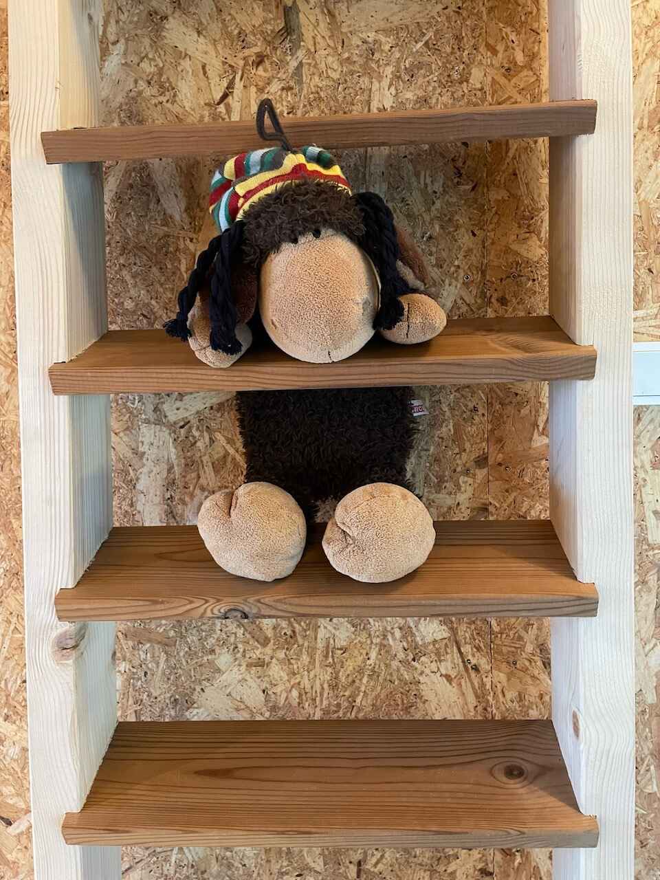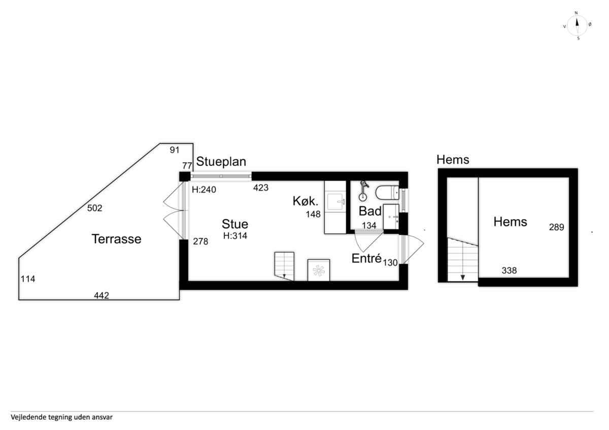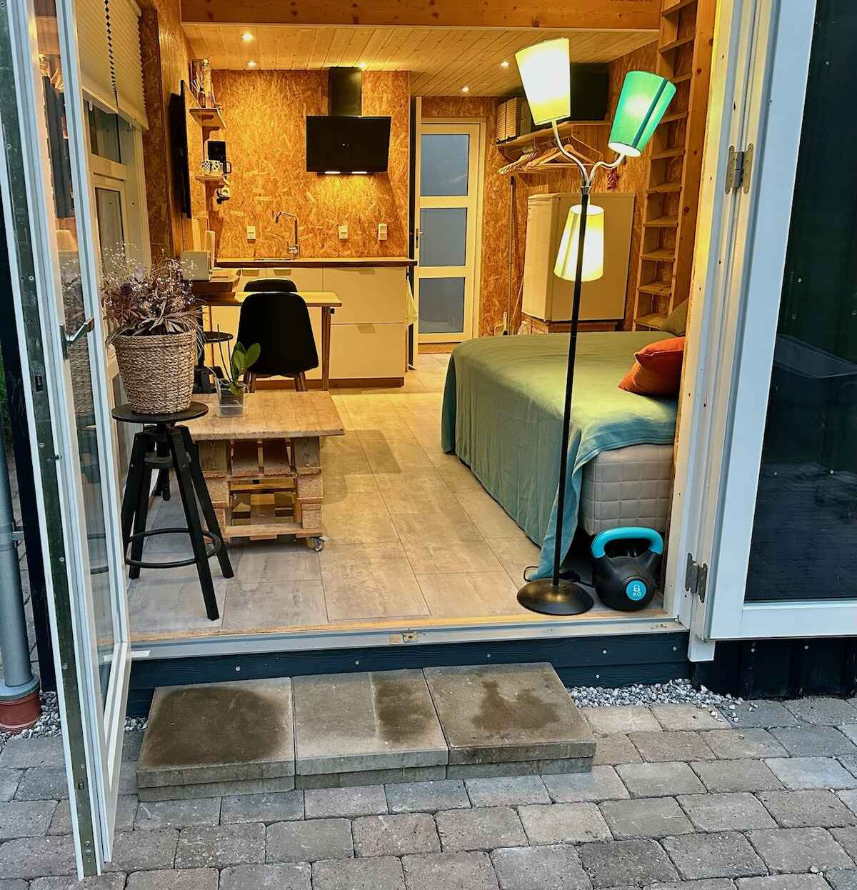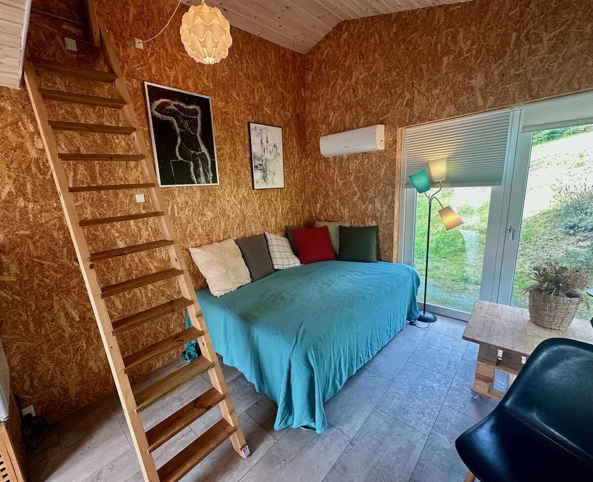 Stueplan rummer en dobbeltseng og et funktionelt køkken med alt nødvendigt udstyr. Badeværelset har bruser, toilet og håndvask. På hemsen findes en ekstra madras, som giver en fleksibel tredje soveplads.