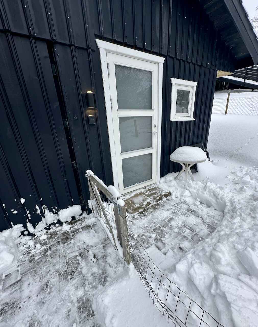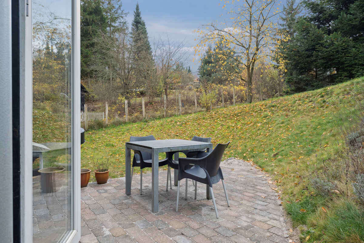 Udenfor ligger en lille have og terrasse med bord, stole og solseng, perfekt til lange morgenstunder eller stille aftener. Der er egen parkeringsplads samt mulighed for at sætte MC og cykler i carport ved dårligt vejr.