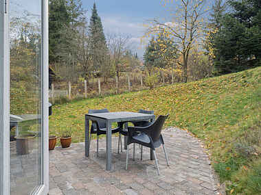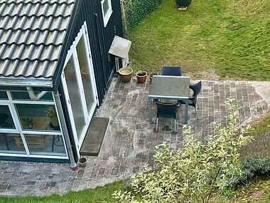 Udenfor ligger en lille have og terrasse med bord, stole og solseng, perfekt til lange morgenstunder eller stille aftener. Der er egen parkeringsplads samt mulighed for at sætte MC og cykler i carport ved dårligt vejr.
