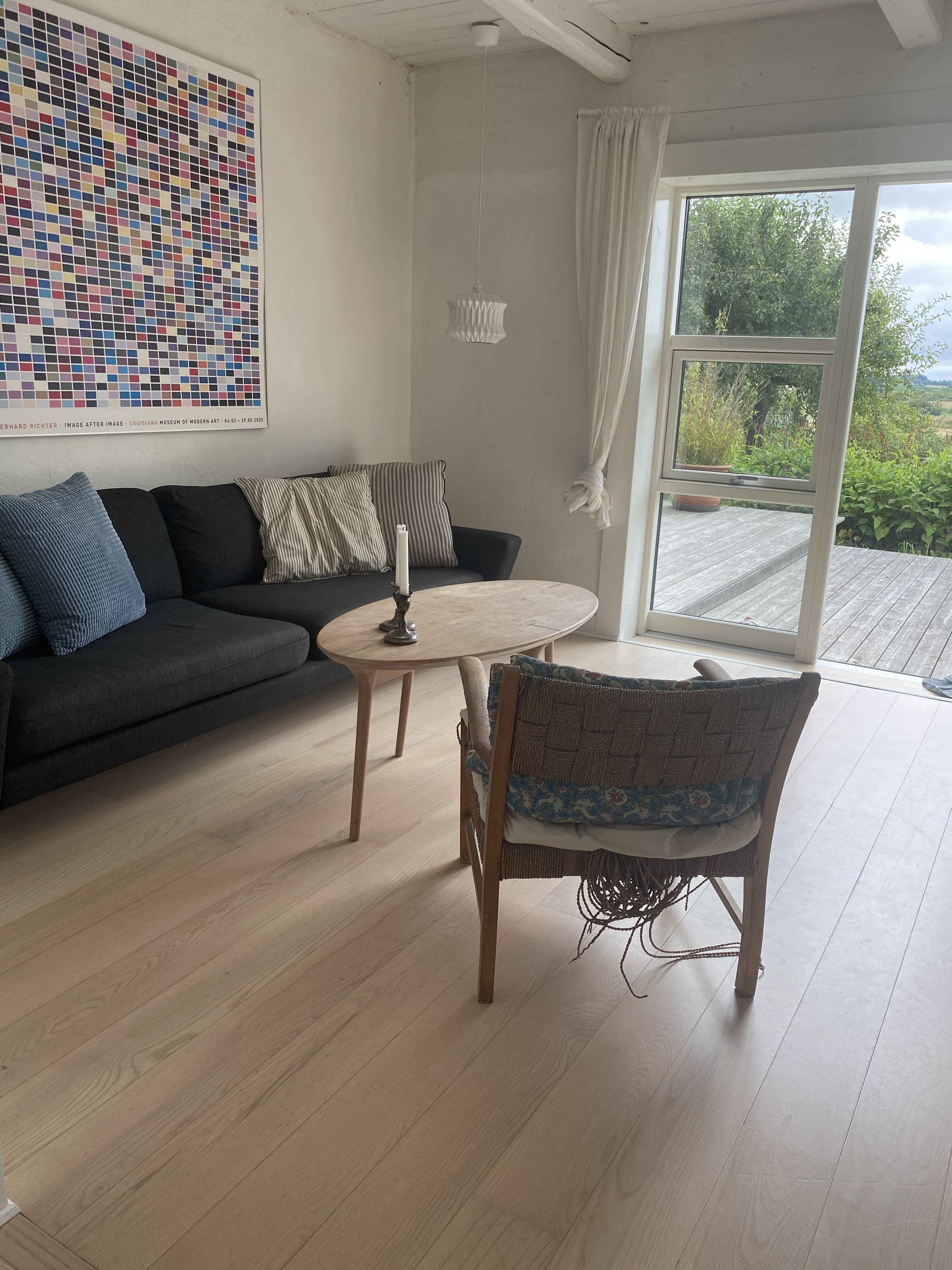 Fra stuen er der udgang til en stor og funktionel terrasse. Her er god plads til måltider i det fri, leg eller ren afslapning. En brændeovn skaber hygge på kølige dage, og fra huset er der frit udsyn til markerne omkring grunden.